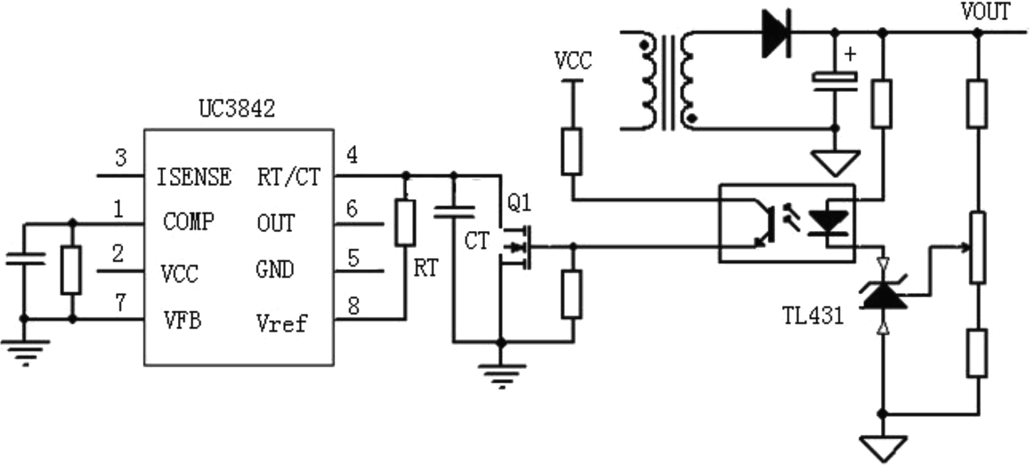 UC3842芯片作为小功率开关电源的PWM脉宽调制芯片,在进行开关电源维修过程中,经常会遇到由于故障引起的uc3842/uc3844不能正常工作,现将电源不能起振或轻微起振(测量输出端电压低),但没有正常工作(表现为8Pin无5V)可能的原因作如下总结: