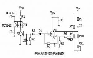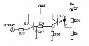 输出限压保护电路如下图,当输出电压升高,稳压管导通光耦导通,Q1基极有驱动电压而道通,UC3842③电压升高,输出降低,稳压管不导通,UC3842③电压降低,输出电压升高。周而复始,输出电压将稳定在一范围内(取决于稳压管的稳压值)。