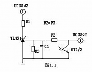 当输出电路短路,输出电压消失,光耦OT1不导通,UC3842①脚电压上升至5V左右,R1与R2的分压超过TL431基准,使之导通,UC3842⑦脚VCC电位被拉低,IC停止工作。UC3842停止工作后①脚电位消失,TL431不导通UC3842⑦脚电位上升,UC3842重新启动,周而复始。当短路现象消失后,电路可以自动恢复成正常工作状态。