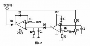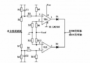 取样电压分为两路,一路经R1、R2、R3、R4分压后输入比较器3脚,如取样电压高于2脚基准电压,比较器1脚输出高电平去控制主控制器使其关断,电源无输出。另一路经R7、R8、R9、R10分压后输入比较器6脚,如取样电压低于5脚基准电压,比较器7脚输出高电平去控制主控制器使其关断,电源无输出。