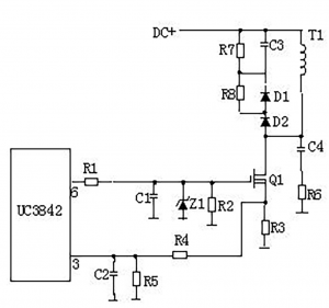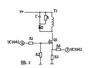 R4、C3、R5、R6、C4、D1、D2组成缓冲器,和开关MOS管并接,使开关管电压应力减少,EMI减少,不发生二次击穿。在开关管Q1关断时,变压器的原边线圈易产生尖峰电压和尖峰电流,这些元件组合一起,能很好地吸收尖峰电压和电流。从R3测得的电流峰值信号参与当前工作周波的占空比控制,因此是当前工作周波的电流限制。当R5上的电压达到1V时,UC3842停止工作,开关管Q1立即关断。