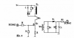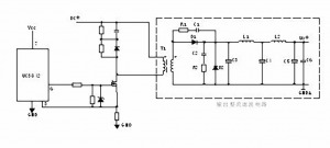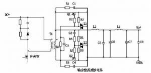 T1为开关变压器,其初极和次极的相位同相。D1为整流二极管,D2为续流二极管,R1、C1、R2、C2为削尖峰电路。L1为续流电感,C4、L2、C5组成π型滤波器。