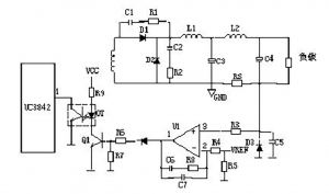 当输出U0升高,经取样电阻R7、R8、R10、VR1分压后,U1③脚电压升高,当其超过U1②脚基准电压后U1①脚输出高电平,使Q1导通,光耦OT1发光二极管发光,光电三极管导通,UC3842①脚电位相应变低,从而改变U1⑥脚输出占空比减小,U0降低。 当输出U0降低时,U1③脚电压降低,当其低过U1②脚基准电压后U1①脚输出低电平,Q1不导通,光耦OT1发光二极管不发光,光电三极管不导通,UC3842①脚电位升高,从而改变U1⑥脚输出占空比增大,U0降低。周而复始,从而使输出电压保持稳定。调节VR1可改变输出电压值。