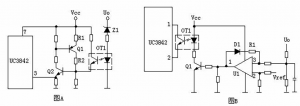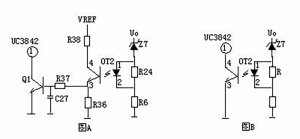 图A的工作原理是,当输出电压Uo升高,稳压管导通,光耦导通,Q2基极得电导通,由于Q2的导通Q1基极电压降低也导通,Vcc电压经R1、Q1、R2使Q2始终导通,UC3842③脚始终是高电平而停止工作。在图B中,UO升高U1③脚电压升高,①脚输出高电平,由于D1、R1的存在,U1①脚始终输出高电平Q1始终导通,UC3842①脚始终是低电平而停止工作。