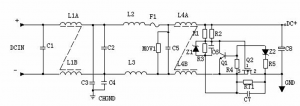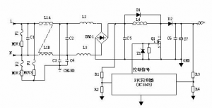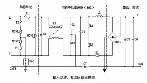 ①、输入滤波电路:C1、L1、C2组成的双π型滤波网络主要是对输入电源的电磁噪声及杂波信号进行抑制,防止对电源干扰,同时也防止电源本身产生的高频杂波对电网干扰。C3、C4为安规电容,L2、L3为差模电感。