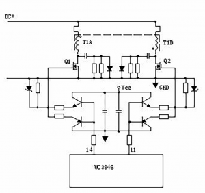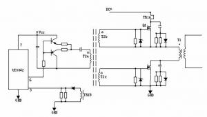 5、有驱动变压器的功率变换电路:T2为驱动变压器,T1为开关变压器,TR1为电流环。