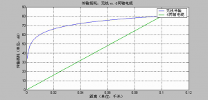 目前CATV常用的线缆是SY(W)V-75-5同轴电缆,SY(W)V-75-5是专门为有线电视生产的,传统观点认为传输2.4g的频段衰减很大。但根据实际测量,同轴电缆率衰一般是50db/100米左右。 微波链路损耗计算公式:损耗(以dB为单位)=32.5+20log( 频率,GHz) + 20log(距离,米)+传输线缆损耗。假设传输到50米处,通过计算,采用CATV 线缆的传输损耗要比通过空气传输少9db左右,如果再考虑墙壁对无线传输的15~25dB损耗,CATV线缆传输至少要比传统的覆盖方式减少了25db 的损耗,WOC无源天线延伸系统就是基于这点提出的。