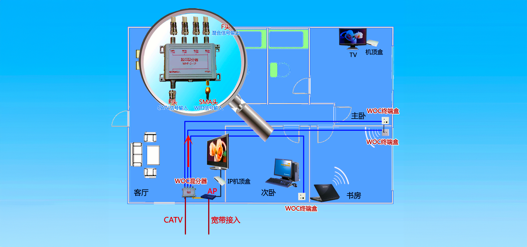简单来说,WOC是一套无源天线延伸系统。它利用现有的CATV线缆作为AP无线信号的传输媒介,具体工作原理如下: