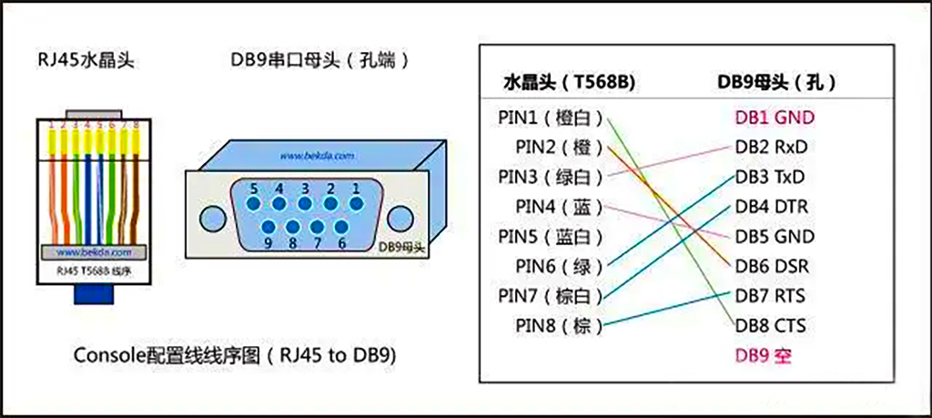 RJ-45(水晶头) | Signal(信号) | Direction(方向) | DB9(调制解调器) | DB9(串口线序) |