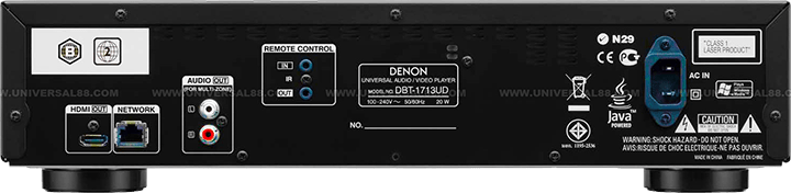 Denon的3D“通用”光盘播放技术能播放几乎所有流行的光盘格式,包括高清蓝光光盘、DVD音频和超级音频CD高解析度立体声和多声道音乐格式光盘,并能播放DVD视频和音乐CD。DBT-1713UD还支持通过网络(DLNA 1.5)和USB播放本地储存的音频、照片和视频内容,并且支持各种在线视频流播放服务,如Netflix和Youtube等。所有这些都借助Denon超级音频和视频技术实现。