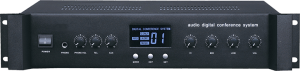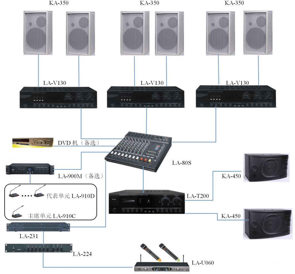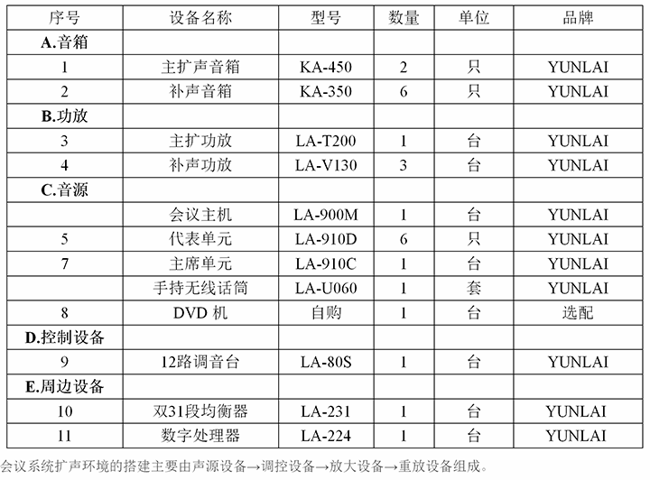 一个完整的会议系统主要由声源设备(如话筒等),调控设备(如调音台等),放大设备(如功率放大器),重放设备(如音箱)和周边设备(如均衡器,分讯器等)组成。