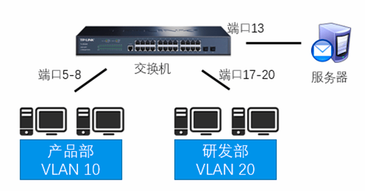 实例:现有部门A和部门B,还有一个服务器,所有电脑和服务器连接在同一个交换机下。要求部门A和部门B之间不能通信,但都可以访问服务器。网络拓扑如下: