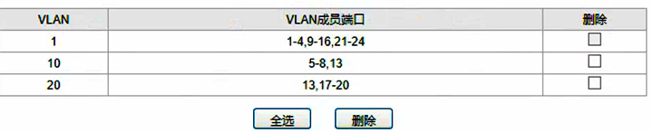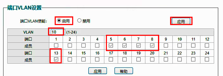2、VLAN的划分:在输入框中输入10,选择对应的端口,注意添加上服务器所在端口13,完成后点击应用。VLAN 20重复第2步。