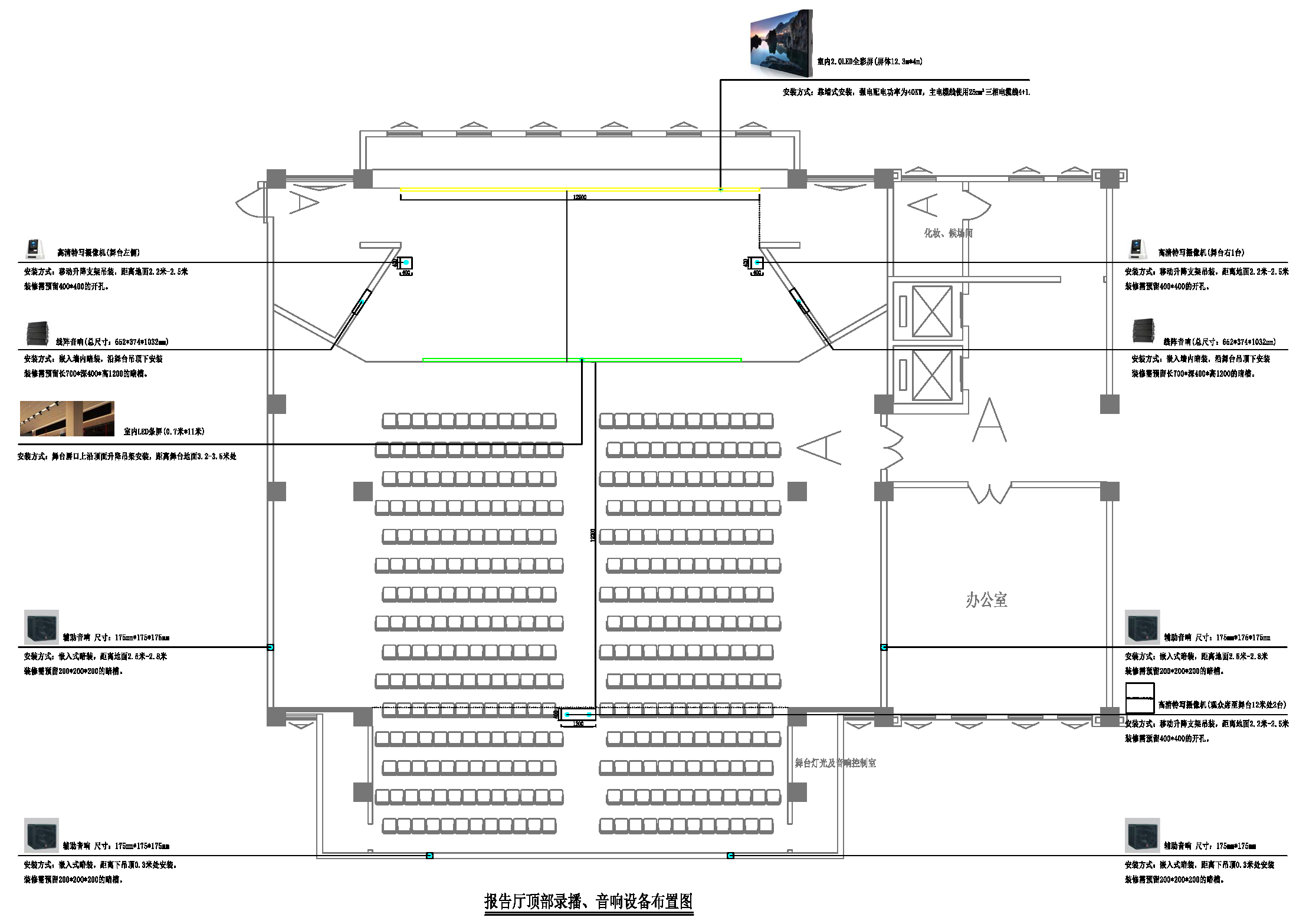 ③、报告厅顶部录播、音响设备布置图