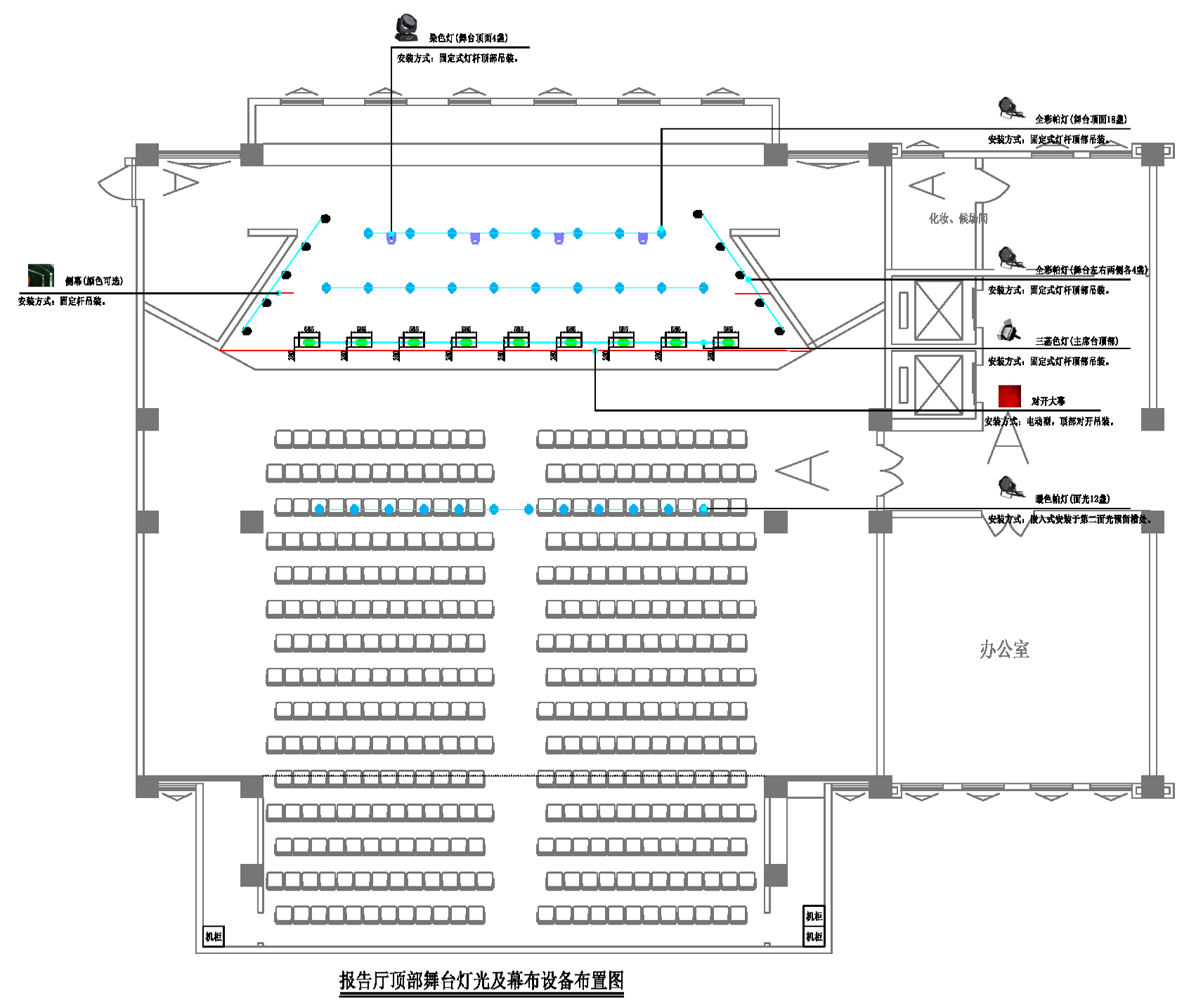 ④、报告厅顶部舞台灯光及幕布设备布置图