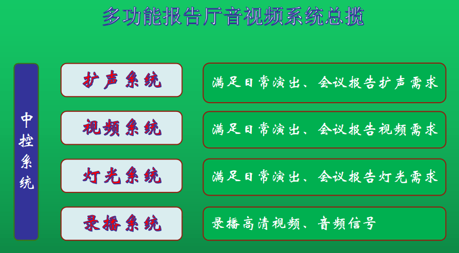 使用功能:本项目是集音视频会议系统、录播系统、大屏显示系统、小型舞台灯光系统为一体的多功能场馆。