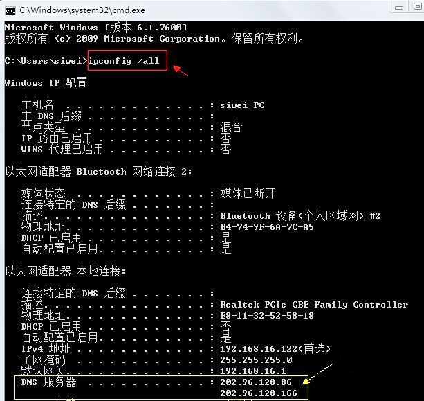 DNS Servers . . . . . . . . . . . : 202.96.104.27(主要DNS服务器)
